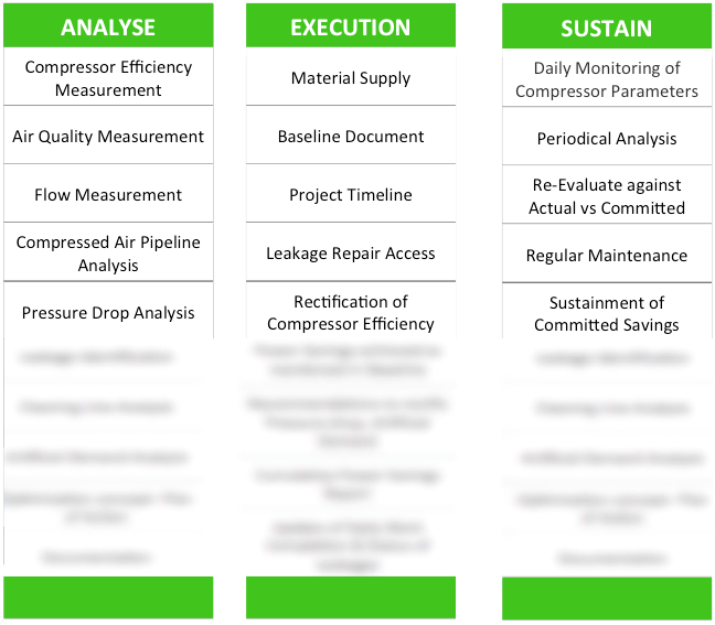 We team of technocrats in compressed air system come up with an innovative solution to reduce your total ownership cost in compressed air system. Below methodology is followed to utilize the compressed air system in an efficient way.