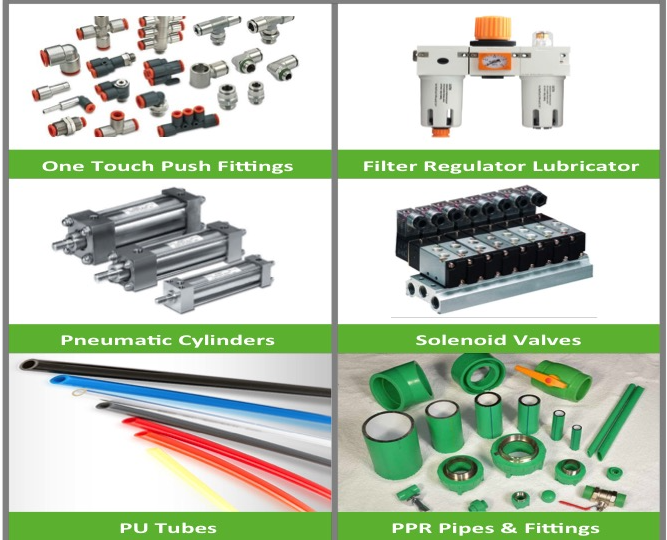 We supply complete range of PPR pipes and fittings. We are the distributor of India’s largest range of piping products of PPR and pneumatic spares. We sell world class wide range of pneumatic products such as One touch fitting, PU tubing, Seal kits, Cylinders, Filter, Regulators, Lubricator, Control valves, etc.